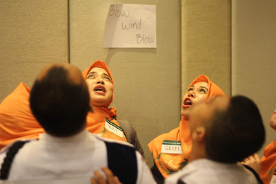 lanjut... ini adalah yang terkonyol! jadi assignment ini bikin aku kaget karena bisa-bisanya ginian masuk jadi bahan penilaian hahahaha. peserta diminta untuk berakting, berdrama, dengan tujuan di sini bagaimana kita menunjukkan kepedulian dan rasa empati terhadap sesama, karena ini sangat penting di dalam service. dan kali ini tugasnya per-region masing-masing, di sini chemistry aku, mas Taufiq, dan pak Hartadi benar-benar diuji. jadi masing-masing region dikasih tema yang beda-beda, yang sistemnya cabut kayak arisan gitu, dan kita kebagian tema yang clue-nya begini: "haduh! depan kantor banjir! gimana nih gak bisa pulang!"